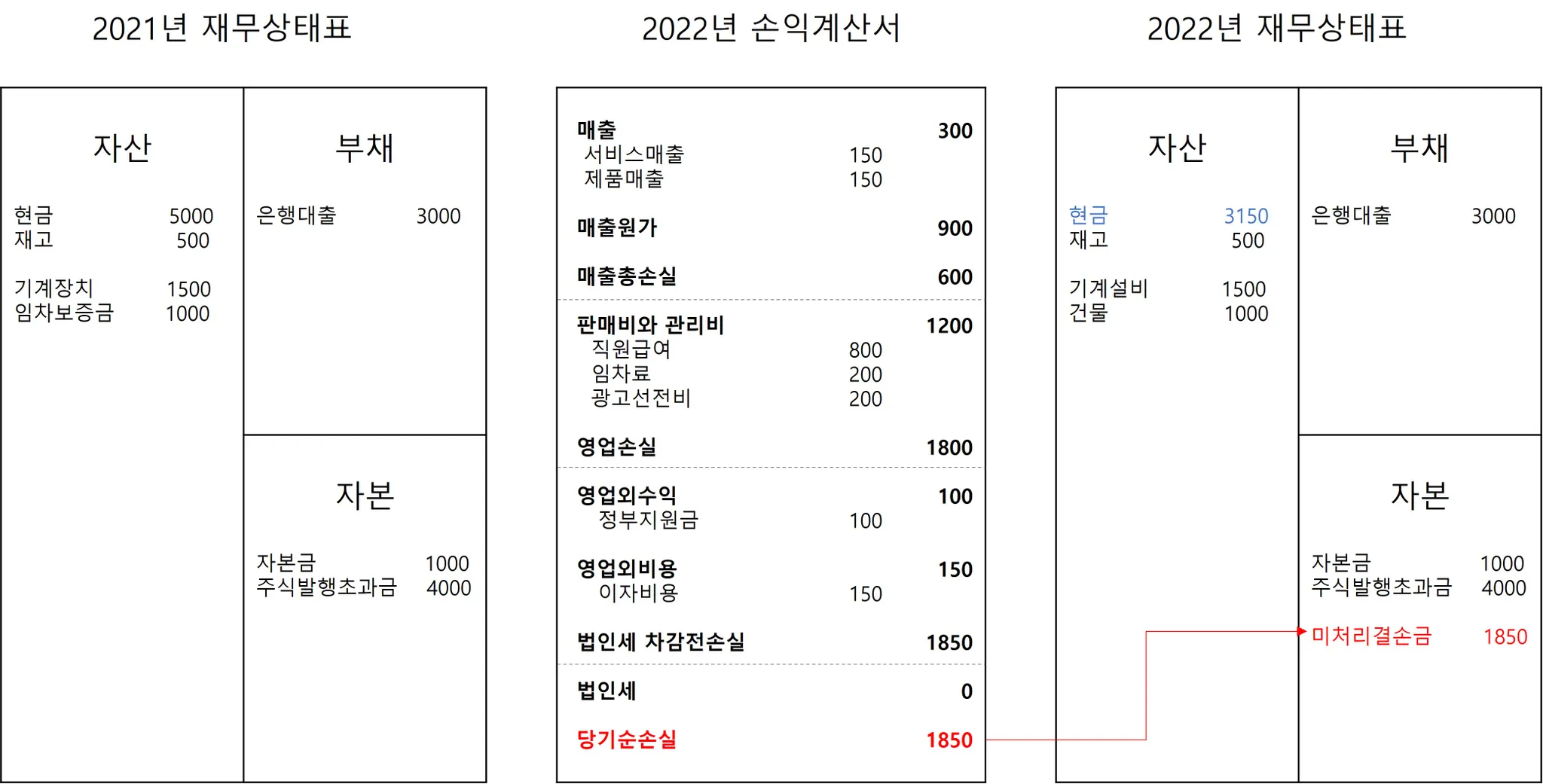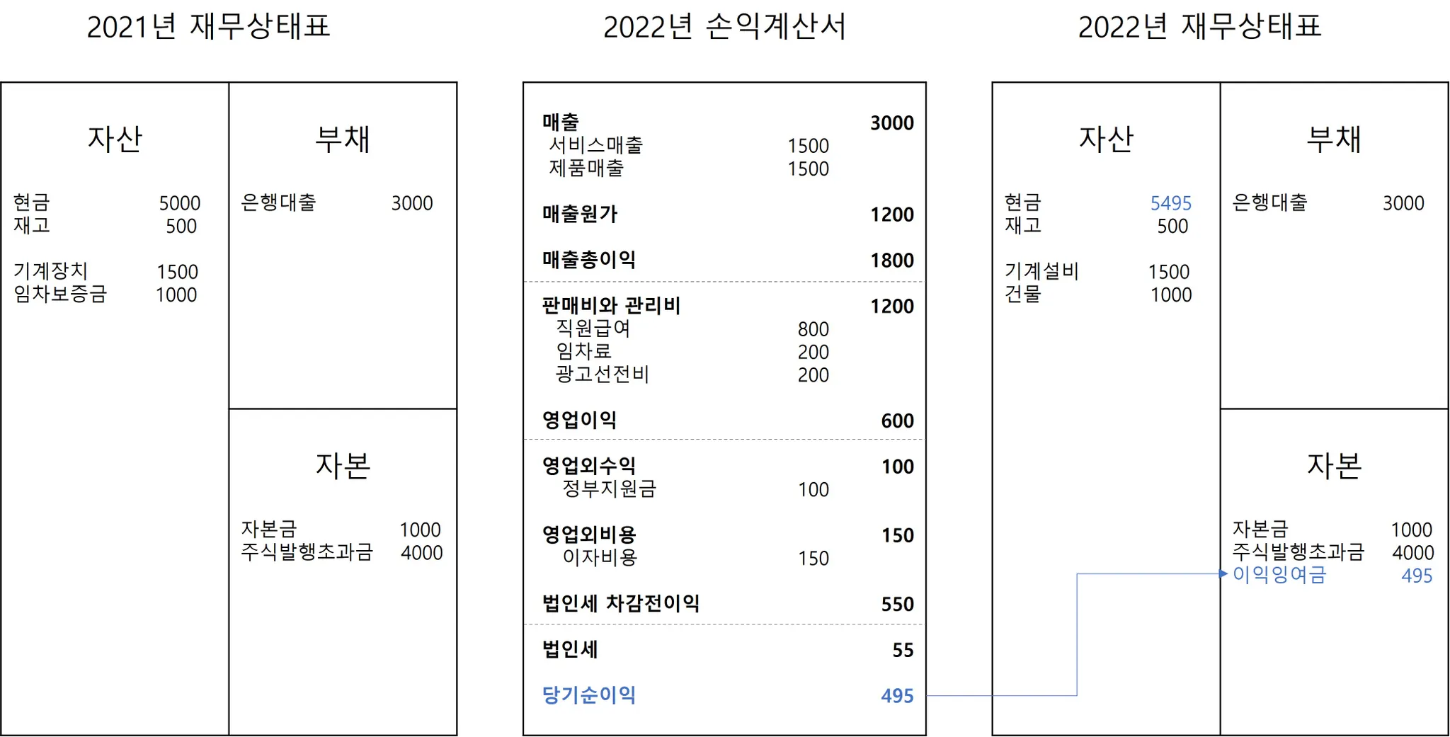 손익계산서의 결과가 재무상태표상 자본에 귀속되는 것이 핵심입니다.
