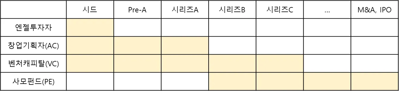 시드투자 때에는 제품 구현을 도와줄 수 있는 AC나 VC, 시리즈 B 투자 때에는 큰 자본을 제공할 수 있는 VC나 PE를 찾게 됩니다.